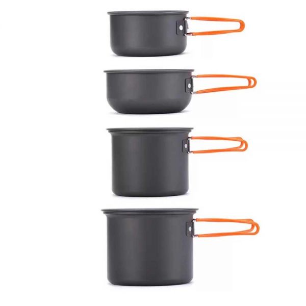 kit de panelas Mountain Cook 4 peças da Naturehike: Leve e pequeno para ser levado para a montanha, mas grande o suficiente para preparar a janta para até 3 famintos montanhistas, esse jogo, como o próprio nome diz, possui 4 peças individuais que podem ser utilizadas individualmente ou em conjunto, formando 2 panelas com tampa. Um detalhe interessante é que as tampas do kit de panelas Mountain Cook podem ser utilizadas como pratos ou também como pequenas panelas, sendo perfeitas para preparar aquele delicioso kit de Strogonoff liofilizado que possui 3 pratos! Confeccionado em alumíno oxidado, seus cabos são dobráveis e cobertos com borracha, que facilitam seu armazenamento e seu uso, principalmente por não reterem calor. Já a oxidação do alumínio, além de ajudar a não grudar os alimentos, não agrega peso no conjunto e não descola, garantindo maior durabilidade. Seu peso total é de apenas 490 gramas, muito leve, mesmo comparado com kit menores!