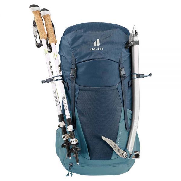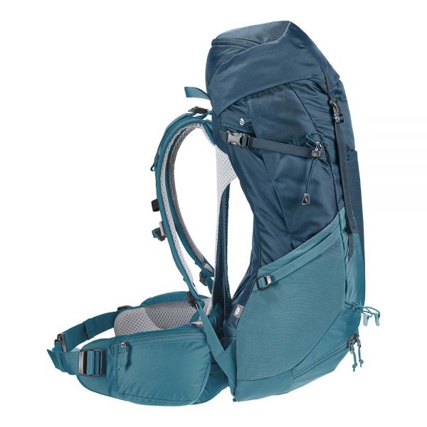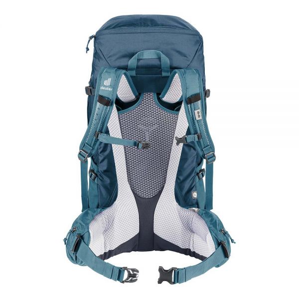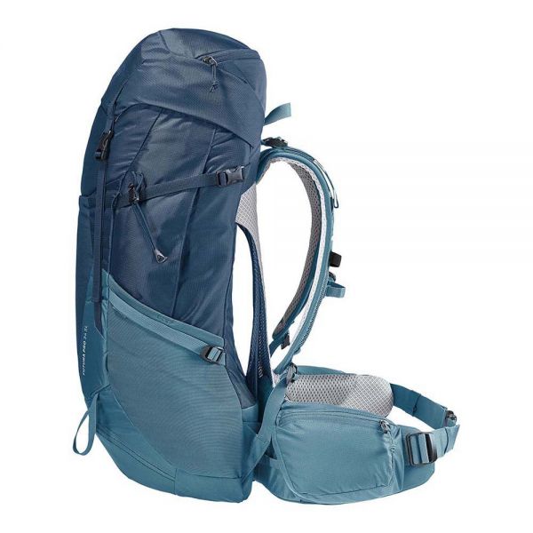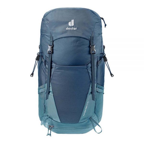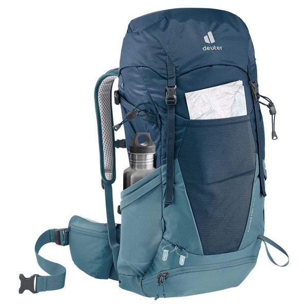 A mochila Deuter Futura Pro 34 SL é uma mochila espaçosa e confortável, ideal para caminhadas de vários dias, seja em um trekking, hiking, escalada ou até mesmo em viagens. Extremamente confortável, ventilada, totalmente ajustável e resistente à água. Seu costado é extremamente ventilado, pois, conta com o sistema em tela e armação de metal Aicomfort Sensic Pro, com barrigueira flexível de fácil ajuste, proporciona conforto ao ser transportada devido ao sistema Vari Flex, que permite variedade e liberdade nos movimentos do corpo mesmo com peso e distribui o mesmo no quadril. Desenhada ergonomicamente para proporcionar bem estar, suas alças são fabricadas em 3D Air Mesh com desenho anatômico e regulagem de carga Active Fit. Seus compartimentos são divididos em: principal (amplo, com fechamento em cordão ajustável e bolso em elástico no costado), o fundo (possui abertura em zíper para ser acessado pela base da mochila) e a tampa (bolso grande interno e bolso externo, ambos com fechamento em zíper). Em sua parte inferior, a mochila possui dois bolsos, sendo um com acesso ao compartimento principal e outro para o armazenamento da capa de chuva. Na parte lateral, a Futura Pro 34 SL possui bolsos expansíveis com ajuste em fitas e compressão e bolsos em tecido Mesh para o armazenamento de garrafas de água ou demais objetos, além de saída para mangueira de bolsa de hidratação (não acompanha sistema de hidratação) e é compatível com sistema de hidratação de até 3 litros. Na parte frontal, há a possibilidade de se pendurar bastões de caminhada por meio de dois loops em elástico. Na barrigueira há dois bolsos pequenos com fechamento em zíper e uma das alças conta com fitas de fixação para armazenar objetos. A barrigueira é acolchoada e anatômica com construção bi-laminada para gerar mais conforto. Possui sistema de fivelas com ajuste sendo puxado para frente, tiras de compressão laterais, alças feitas em 3D AirMesh com sistema de ajuste de carga e revestimento interno em PU - Poliuretano para conferir maior resistência à água.