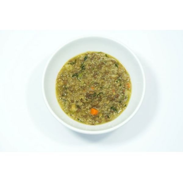 Ingredientes: lentilha, mix de quinoa (branca, vermelha e preta), batata, cebola, couve, cenoura, alho, espinafre, alho-poró, salsa, azeite de oliva extra virgem, cebolinha francesa, sal moído, pimenta dedo de moça e gengibre. NÃO CONTÉM GLÚTEN. ALÉRGICOS: PODE CONTER SOJA.
