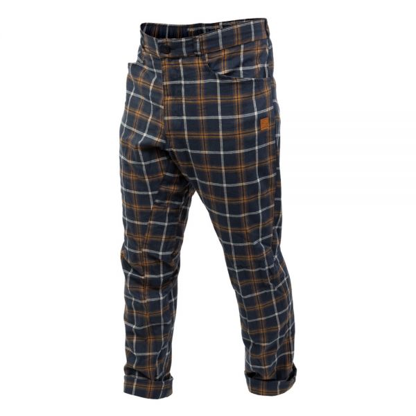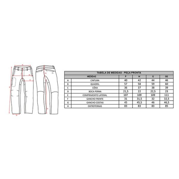 Calça em flanela com modelagem anatômica nos joelhos e nas entrepernas, o que oferece conforto. Possui dois bolsos frontais tipo faca, um bolso lateral e um traseiro com fechamento em zíper. Os puxadores dos zíperes auxiliam a abertura dos bolsos. A flanela favorece equilíbrio térmico, é macia e protege em dias mais frios.